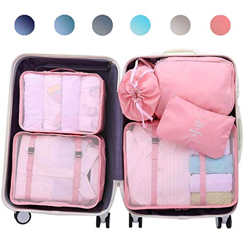 • Luggage Organizer, Suitcase Packing Cubes, Compression Cells, Accessories Bags Made With Wearable Waterproof Material. Perfect for Travel, Long Trips, Camping (Pink - 6 PCS)