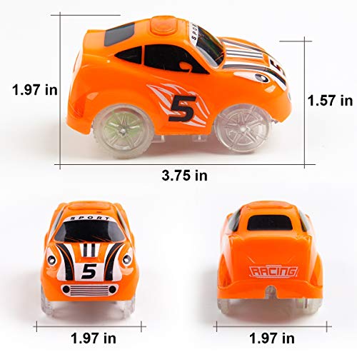 • Mini Tudou Magic Light Up Track Cars with Road Sign & Tunnel, 2 Pack Replacement Race Car with 3 LED Lights Glow in The Dark, Compatible with Most Tracks (Blue+Orange)