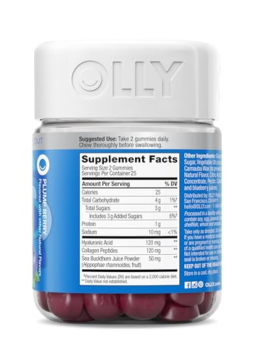 • OLLY Glowing Skin Gummy, Hydrated & Youthful Skin,* Hyaluronic Acid, Collagen Peptides, Sea Buckthorn, Plump Berry Flavor, 25 Day Supply - 50 Count