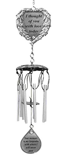 BANBERRY DESIGNS Memorial Windchimes - I Thought of You with Love Today Poem Engraved on This Wind Chime - Angel Wings Wrapped Around a Heart and Teardrop Charm - in Loving Memory Chimes, Pewter, 15" Tall