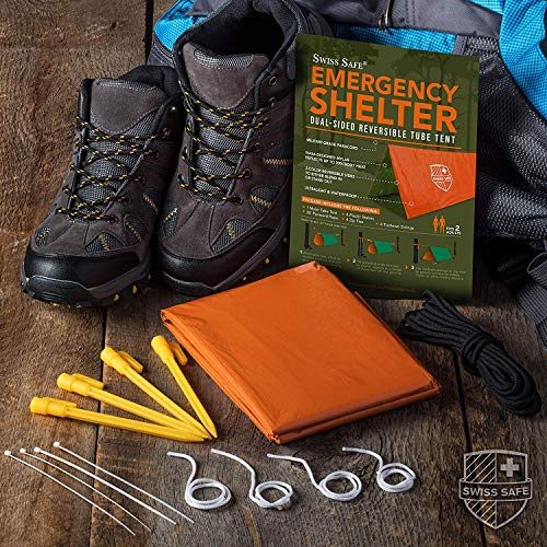Swiss Safe Emergency Survival Shelter Tent (Reversible Two-Sided Tent) + Paracord, Tent Spikes, Zip-Ties: 100% Waterproof, Ultralight and Extra Large, Army Green and Orange, 4 x 8 ft