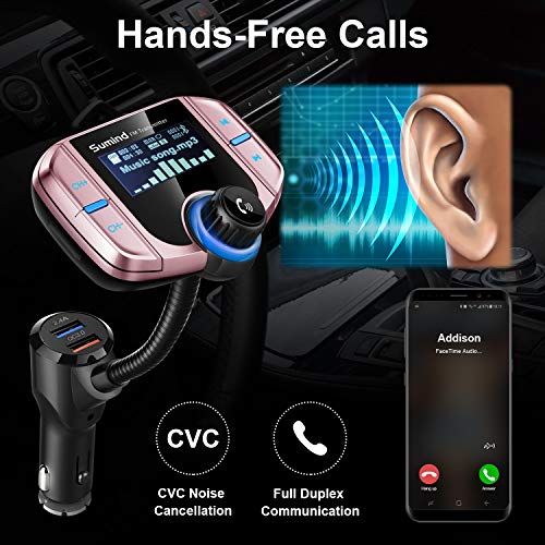 Sumind Upgraded Bluetooth FM Transmitter, Wireless Radio Adapter Hands Free Car Kit with 1.7'' Display, QC3.0 and Smart 2.4Amp Dual USB Ports, AUX Input/Output, TF Card Mp3 Player (Normal, Rose Gold), Small
