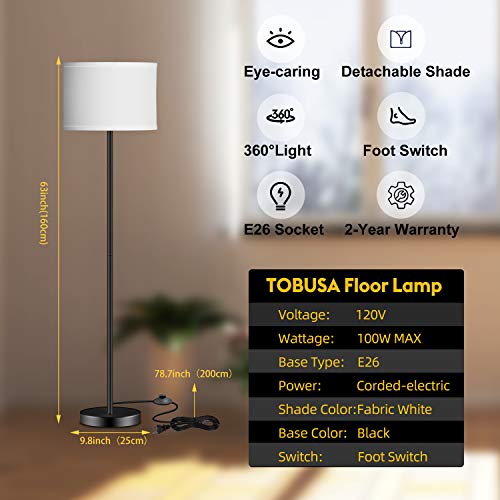 TOBUSA LED Floor Lamp Simple Design, Modern Standing Lamp with Shade,Tall Lamp for Living Room Bedroom Office Study Room, Black Pole Lights with Foot Switch, White Stand Up Lamp Fabric, E26 Base