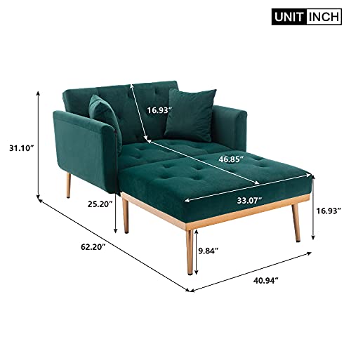 SLEERWAY Velvet 2 in 1 Chaise Lounge Chair Indoor, Modern Single Sofa Bed with Two Pillows, Recliner Chair with 3 Adjustable Angles, Convertible Sleeper Chair for Living Room and Bedroom (Green), 62.2D x 40.94W x 31.1H Inch