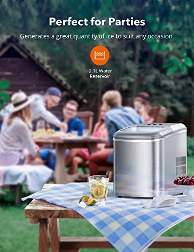 Voltage: 120V-60HzRated Power: 120WMaterial: Stainless Steel + ABS Operating Cycle: 6-9minsAmount of Ice per Cycle: 9pcsDaily Capacity: 22lbs / 10kgIce Basket Capacity: 1.3lbs / 0.6kgWater Reservoir Capacity: 2.1LNet Weight: 20.5lbs / 9.3kgSize: 9.5 x 12.4 x 14.7in / 24.4 x 31.5 x 37.3cm What’s in the Box: 1 x Ice Maker Machine for Counter Top1 x Ice Basket1 x Ice Scoop1 x User Guide