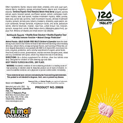 • Natures Plus Animal Parade Source of Life GOLD Childrens Multivitamin - Assorted Cherry, Orange & Grape Flavors - 120 Chewable Animal Shaped Tablets - Organic Whole Foods, Gluten Free - 60 Servings