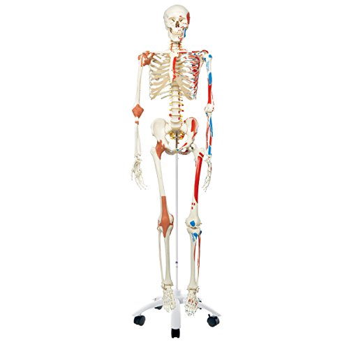 Super Human Skeleton Model "Sam" - Flexible with Muscles and Ligaments on a Pelvic Mounted Stand. Of course this top-of-the-line version contains all the benefits you have come to expect in our high-quality 3B Scientific standard skeletons. Sam additionally allows you to demonstrate the movements of the skull and head joints as well as all natural human postures due to the fully flexible vertebral column. The unique combination of flexible vertebral column, muscle origins and insertions, numbered bones, flexible joint ligaments and a disc prolapse between the 3rd and 4th lumbar vertebrae display over 600 structures of medical/anatomical interest in this top human skeleton model. Perfect for in depth study of the human skeleton and more. To sum it up: all standard benefits of a 3B ScientificSkeleton model, over 600 hand-numbered and identified details, hand-painted muscle origins and insertions, flexible joint ligaments, flexible vertebral column, emerging spinal nerves and vertebral arteries, disc prolapse between l3 and l4, excellent price-performance ratio, 3-year warranty, First-class natural cast “Made in Germany”, manual final assembly, made of durable, unbreakable plastic, almost realistic weight of the approx. 200 bones, life-size, 3-part mounted skull, individually inserted teeth, stand and dust cover included. Measures 66.9" height. NEW and exclusively with original 3B Scientific anatomy models - now enhanced with 3B Smart Anatomy. Your advantages with all 3B Smart Anatomy models: Free warranty extension from 3 to 5 years, free access to 3B Smart Anatomy courses in the award-winning Complete Anatomy app, this includes 11 3B Smart Anatomy courses with 23 lectures and 117 different views of interactive virtual models, plus 39 quizzes. To unlock these benefits, simply scan the label and register your 3B Smart Anatomy model online. All 3B Smart Anatomy features are completely free of charge. "Virtual meets Reality" developed by 3B Scientific makes learning human anatomy even more effective across all media.
