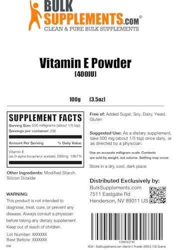 BulkSupplements.com Vitamin E 400 IU Powder - as D-Alpha Tocopherol, Nutritional Supplements - Gluten Free, 500mg per Serving, 100g (3.5 oz) (Pack of 1), 100 Gram