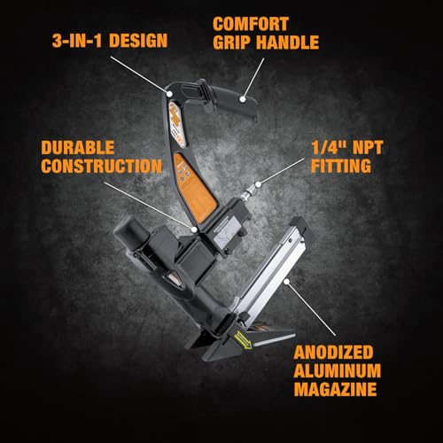 • Freeman PFL618C Pneumatic 3-in-1 15.5-Gauge and 16-Gauge 2" Flooring Nailer/Stapler with Flooring Mallet and Interchangeable Base Plates