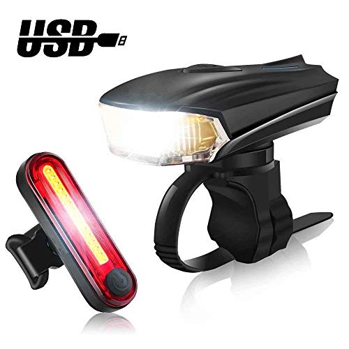 • LED Bike Lights Set -OBDKCAN USB Rechargeable 300LM Waterproof Front Headlight and 100LM Tail Light Including 5 Modes Headlight and 4 Modes Taillight-Smart Sensor,Free Mount Brackets Tool