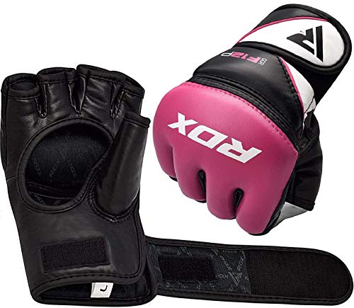 RDX MMA Gloves Grappling Sparring, Maya Hide Leather, Boxing Gloves Men Women Muay Thai Martial Arts Training, Half Finger Adjustable Mitts Wrist Support Kickboxing Cage Fighting Punching Bag Workout, Pink, Medium