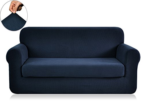 • CHUN YI Stretch Loveseat Sofa Slipcover 2-Piece Couch Cover Furniture Protector, 2 Seater Coat Soft with Elastic Bottom, Checks Spandex Jacquard Fabric, Medium, Dark Blue