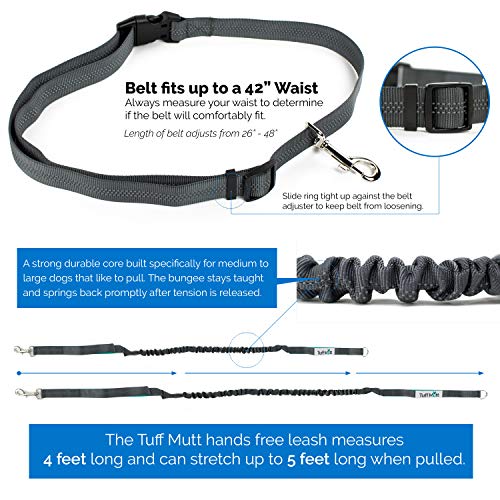 • Tuff Mutt - Hands Free Dog Leash for Running, Walking, Hiking, Durable Dual-Handle Bungee Leash, Reflective Stitching, 4-Foot Long, Adjustable Waist Belt (Fits up to 42" Waist)