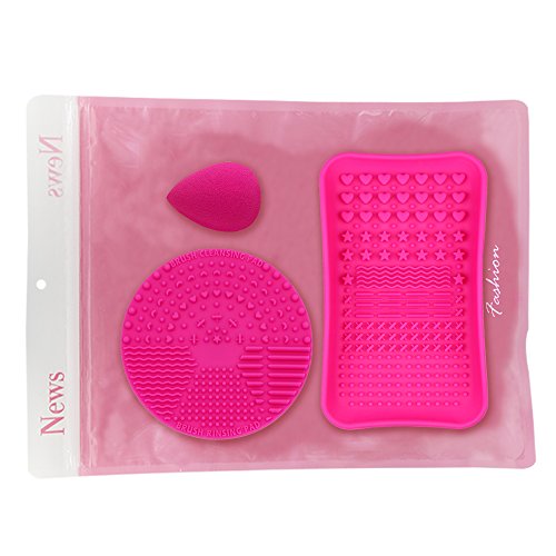 • TailaiMei Makeup Brush Cleaning Mats, 1 Mini Makeup Brush Cleaner mat, 1 Cosmetic Brushes Cleaning Plate Portable Washing Tool and 1 Sponge Blender,Silicone Brush Scrubber for Face and Eye Brush(Pink)