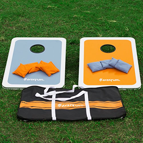 • Harvil Aluminum-Framed Cornhole Bean Bag Toss Game Set with 8 Double-Lined All-Weather Bean Bags and Carrying Case