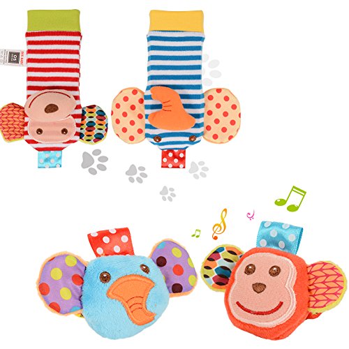• FunsLane Baby Rattle 4 Pcs Baby Wrist Rattles and Foot Finder Set Sock Toys Developmental Soft Animal Toys Adorable Monkey and Elephant Style Baby Shower Gifts