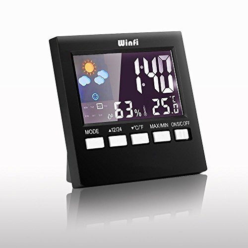 • Winfi Digital Indoor Weather Thermometer, Weather Station, Weather Channel Thermometer, Temperature and Humidity Monitor with Alarm Clock, Time Date and Night Lighting LCD Screen Displaying,Black