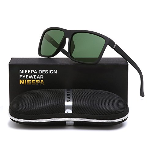 NIEEPA Men's Driving Sports Polarized Sunglasses Square Wayfarer Plastic Frame Glasses (Dark Green Lens/Black Frame), unisex-adult
