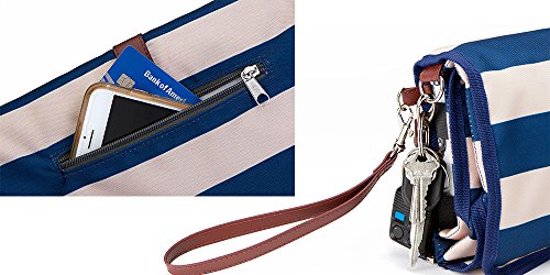 Modish Mommy Portable Changing Pad - Baby Changing Purse | the Only Diaper Clutch with a Shoulder Strap Option | Portable Changing Station - Holds Diaper Changing Pad, Diapers, Wipes, Cream, Baby Outfit | BPA FREE, Navy Blue and Tan Striped