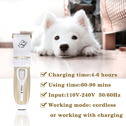 • Hercules Professional Pet Animal Low Noise Trimmer Shaver Clippers Rechargeable Cordless Dogs Cats Quiet Electrical Grooming Tool Hair Trimming Haircut Kits Four (3-6-9-12mm) Combs (White & Gold)