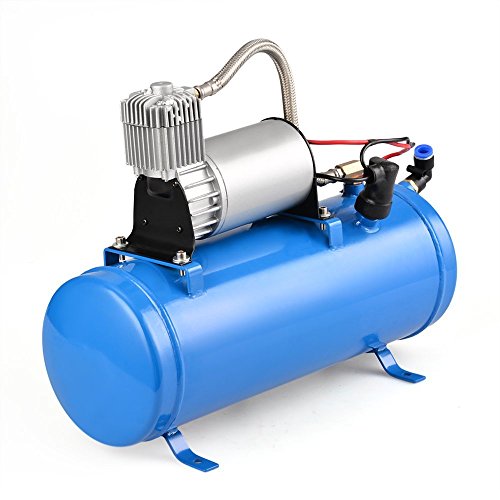 • Kaluo 1.6 Gallon 4 Trumpet 150DB Vehicle Air Horn 12 V Blue Air Compressor & Hose Loud 120PSI Kit Set Air Train Horn for Truck SUV Car Pickup JEEP Boat RV