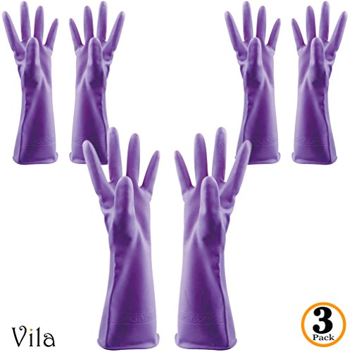 • Vila Rubber Cleaning Gloves --- (Pack of 3) Durable, Leak-Proof, Puncture-Proof Household Gloves - Perfect for Laundry, Dishes, Cleaning Chores - Color Purple