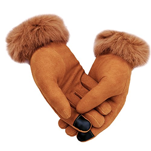 • OZERO Touch Screen Gloves Ladies and Girls Fleece Thermal Gloves with Deerskin Leather and Supple Rabbit Fur Cuff - Insulated and Windproof in Winter - Brown(Medium)