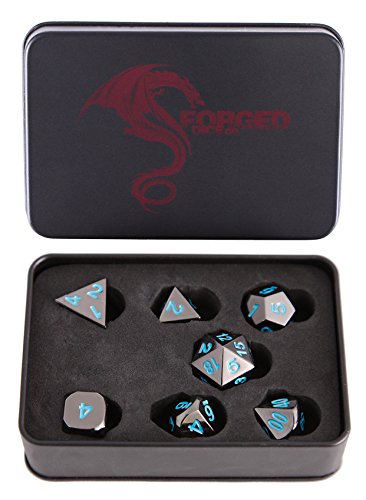 • Forged Dice Co. Metal Gunmetal Silver Color with Arctic Ice Blue Numbers Set of 7 Polyhedral Dice for RPG Gaming Games with Dragon Logo Tin Case