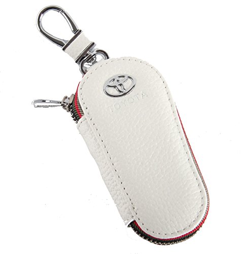• Key chain Bag white Lychee rind pattern Genuine Leather Ring Holder Case Car Auto Coin Universal Remote Smart Key cover Fob Alarm Security Zipper keychain Wallet Bag (Toyota)