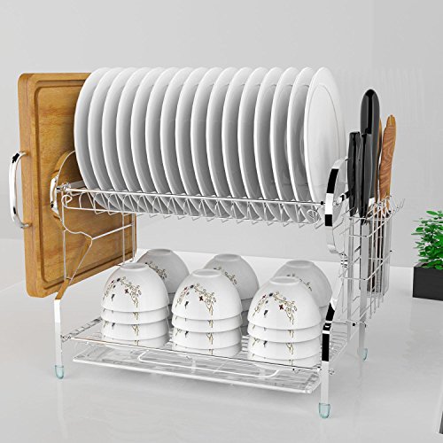 • 2 Tier Dish Drying Rack with Drain Board, Dish Drainer Drying Rack with Cutlery Holder for Counter 16 x 8. x 13inch (Lx W x H)