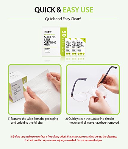 • Ringke Screen and Lens Cleaning Wipes, 200 (50 x 4 Pack) Pre-Moistened Wet Alcohol Wipes Streak Free Portable Individually Wrapped Cleaning Towelettes for Camera, Cell Phone, Eyeglasses, and More