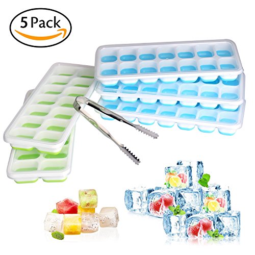 • Silicone Ice Cube Trays 5 Pack With Icing Clips, Flexible 14-Ice Trays with Spill-Resistant Removable Lid for Whisky, Cocktail, Bourbon, LFGB Certified & BPA Free, Stackable Durable and Dishwasher
