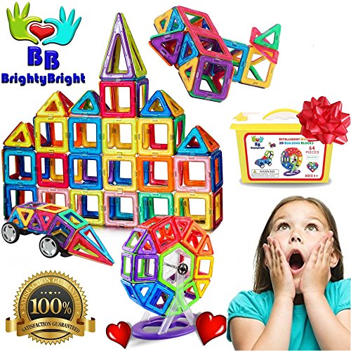 BrightyBright Magnetic Blocks Building Set for Kids - 64 Pc Set Intelligent Magnetic 3D Magnetic Tiles STEM Educational Building Construction Toys for Boys and Girls DELUXE SET with Storage Box, unisex-child