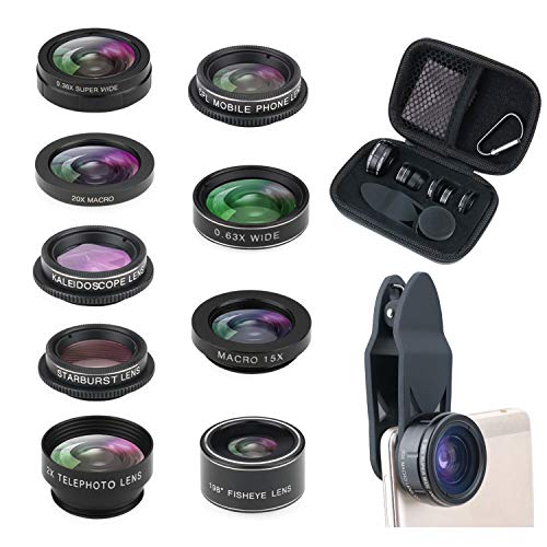 • Phone Camera Lens Kit, 9 in 1 Zoom Universal Telephoto,Fisheye, Super Wide Angle,15X Macro, 0.63X Wide,20X Macro,CPL,Kaleidoscope,Starburst Lens Compatible iPhone,Samsung, Most Andriod Phones