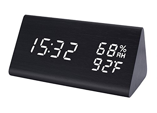 Raercodia Night Clock Wood Desk Clock LED Wooden Alarm Clock Night Light Modern Clock Show Time Date Calendar Temperature Humidity Brightness Adjust Clock Home Office Kids Room(Black,White), Black,white Tri