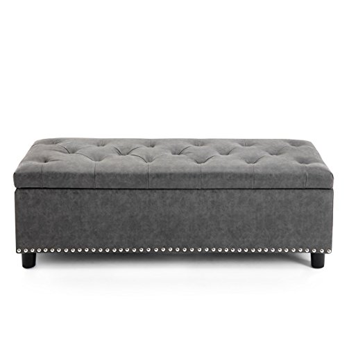 • Belleze 48" Rectangular Faux Leather Linen Storage Ottoman Bench Nailhead Tufted Cushion Top Footrest, Rustic Gray