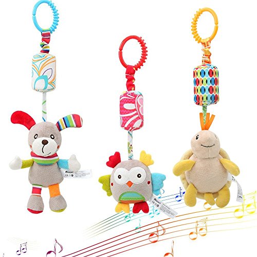 • Daisy 3 Packs Infant Hanging Rattle, Soft Baby Wind Chimes handbell Toy, Stroller Car Seat Crib Hanging Toy for Baby Toddler Boys and Girls, Educational Development Gift - (Puppy, Owl, Tortoise)