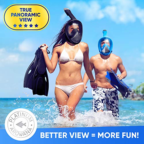 Platinum Arowana Full Face Snorkel Mask for Woman and Men Panoramic View and Curved Face Design, 180 Degree Viewing Anti Fog Leak Proof Tubeless Scuba Mask Gear, Easy Breath Dry Top Water Blocking System Technology, mens, Black/Silver