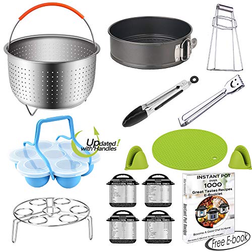 • Large Steamer Basket Set Compatible 6,8 Quart (Qt) Instant Pot Accessories Pressure Cooker, Egg Rack, Springform Pan, Egg Bites Mold, Oven Mitts,Cheat Sheet Magnet, Tong,Bowl Clip, Recipes EBook,14PCS