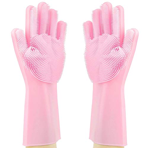 • Magic Saksak Silicone Dishwashing Gloves (1 Pair: Left + Right), Reusable Cleaning Gloves for Kitchen, Bathroom and Pet, Latex Free by ThxToms (Pink)
