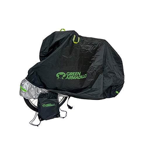 • Green Armadillo Waterproof Bicycle Cover for 1 Bike with Backpack:, 2 Lock Holes, Elastic Hems & Storm Strap. Indoor/Outdoor Bike Storage and Protection (Large)