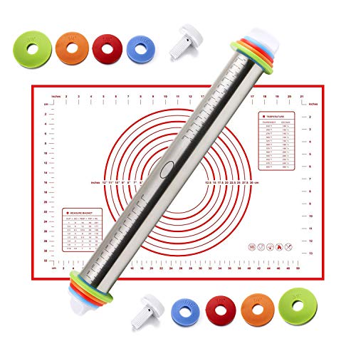 • Adjustable Stainless Steel Rolling Pin,Evermarket Dough Roller with 4 Removable Thickness Rings and Silicone Pastry Mat for Baking Dough,Bakery Holiday Christmas Cookie Chapati Fondan Pastry Pizza Pie
