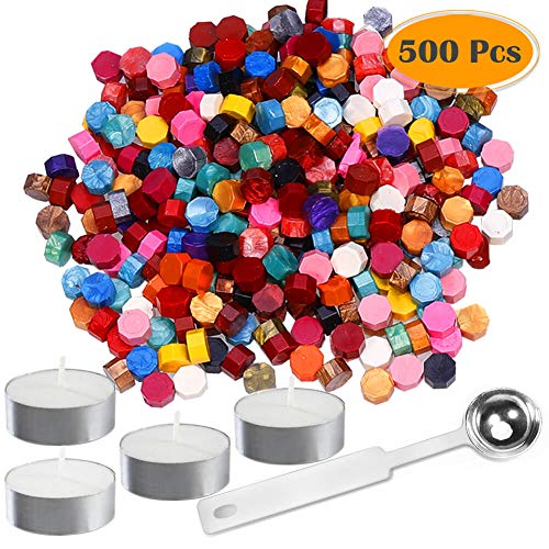 • Anezus 500Pcs Sealing Wax Beads with 4 Pcs Tea Candles and 1 Pcs Wax Melting Spoon for Wax Sealing Stamp (Assorted Colors)