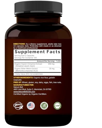 • NatureBell Ceylon Cinnamon Per Serving, 240 Capsules | Made with Organic Sri Lanka Ceylon Cinnamon and Organic Bitter Melon, 2 in 1 Support – Non-GMO, No Gluten