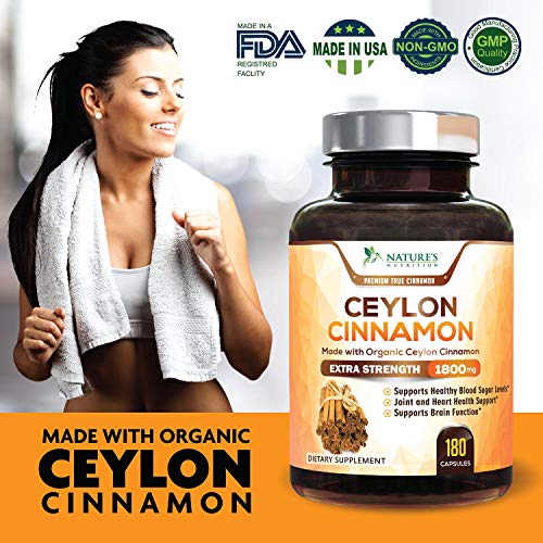 Nature's Nutrition True Organic Ceylon Cinnamon Highest Potency Standardized 1800mg - Organic Ceylon Cinnamon Pills - Healthy Blood Sugar Support Supplement, Vegan Joint Pain Relief Anti-Inflammatory - 180 Capsules