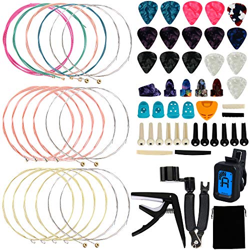 • Augshy 65 PCS Guitar Tool Changing Accessories Kit Including Guitar Strings, Guitar Picks, Pick Holder, Capo, String Winder&Cutter, Thumb Finger Picks, Tuner, Guitar Bones, and Storage Bag for Beginne