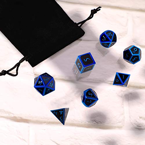 • HESTYA 7 Pieces Metal Dices Set DND Game Polyhedral Solid Metal D&D Dice Set with Storage Bag and Zinc Alloy with Enamel for Role Playing Game Dungeons and Dragons, Math Teaching (Blue Edge Black)