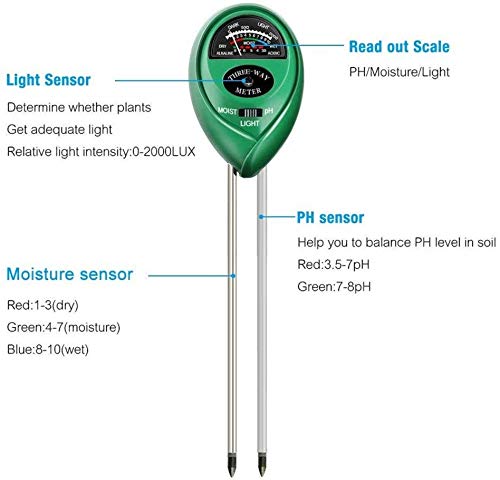 • Lailieu Soil Test Kit 3-in-1 Soil Tester with Moisture,Light and PH Meter, Indoor/Outdoor Plants Care Soil Sensor for Home and Garden, Farm, Herbs & Gardening Tools(No Battery Needed)