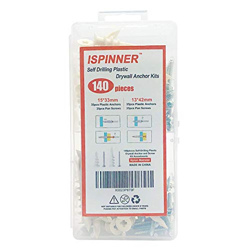 • ISPINNER 140pcs Plastic Drywall Anchors Self Drilling Hollow Wall Anchors with Screws Assortment Kit (13x42mm + 15x33mm)