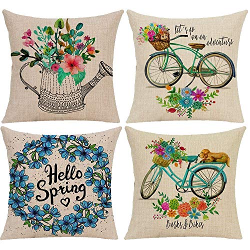 • Wilproo Hello Spring Decorative Pillow Covers, Wreath Bicycle Flower Butterfly Printed Both Sides Sturdy Cotton Linen Pillow Cases for Spring Home Sofa Couch Decor Set of 4 18x18 inches